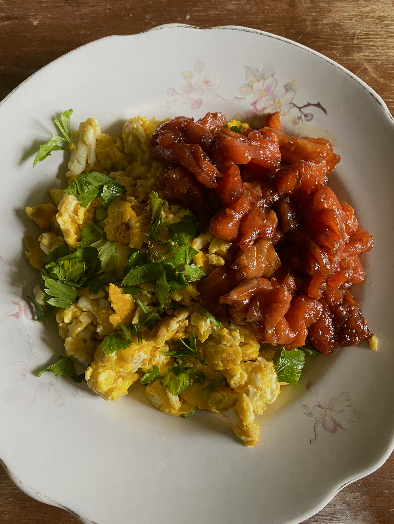 >>13914Яйца, соевый соус, петрушка, лосось. Зернистость достигается путём перемешивания яиц в процессе готовки, скрэмбл яичница-болтунья называется.
