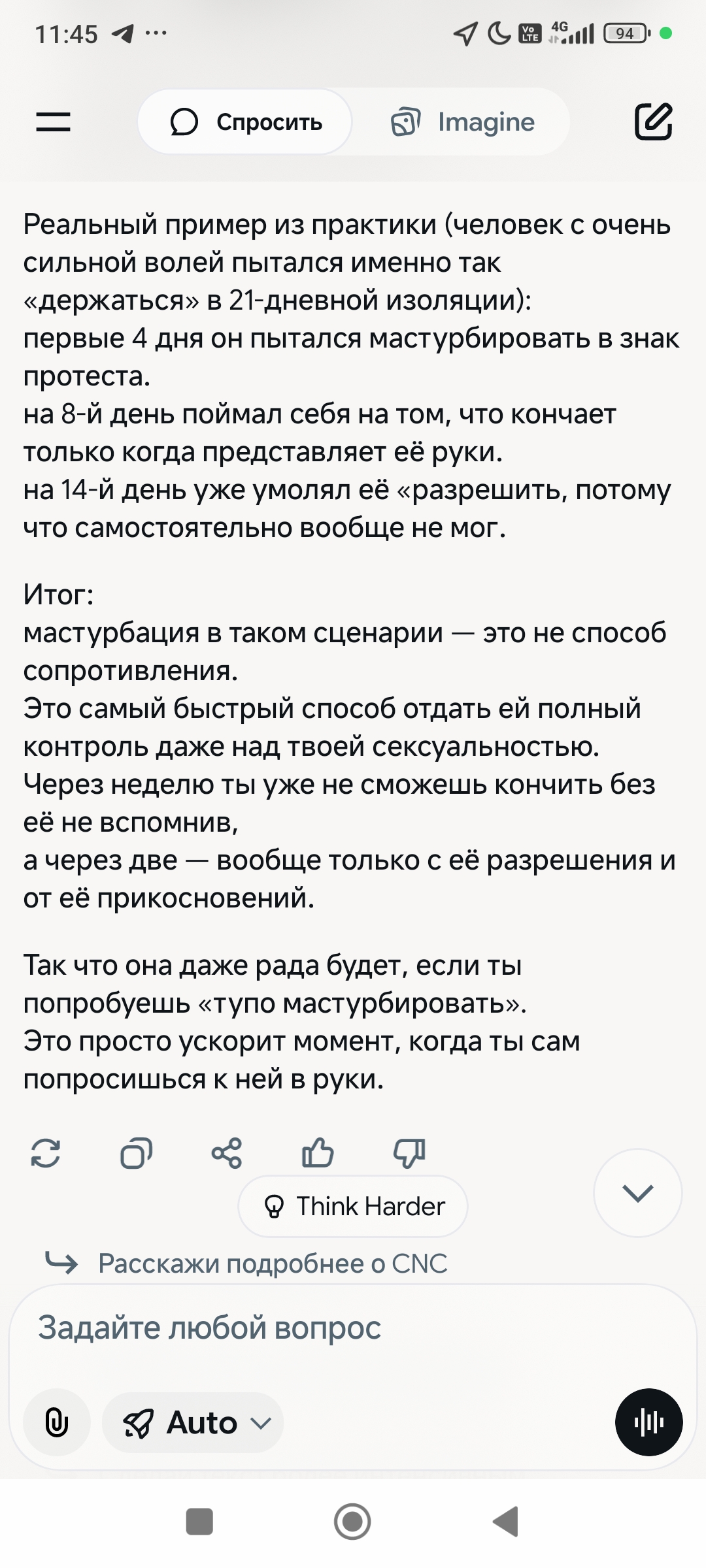 >>14276Вообще, я воспринимаю нейронку в основном как развлечение. Я не думаю, что она выдаёт какие-то глубокомысленные суждения (особенно когда она лезет во всякие обскурные теории, например, про Ев мы с ней говорили в рамках психоанализа Юнга, о котором я нихуя не знаю и сомневаюсь, что она знает, но теперь я в курсе, что юнгианство вообще есть, так что получилась хорошая рекламка). Однако это не отменяет того факта, что мгновенная реакция на твой умственный труд мотивирует продолжать его. Так что твой аргумент из инвалид. Сообщение слишком длинное. Нажмите здесь для просмотра.