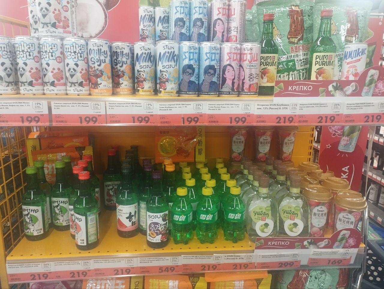 Интересная полка в ленте, на которой безалкогольный спрайт (почему-то только он из подобных) стоит рядом с пивом тринадцать градусов и чухаем (восточной ягой). Видимо, сгруппировано по признаку китайскости. По-моему, это свинство. Можно же перепутать спирт с газировкой.