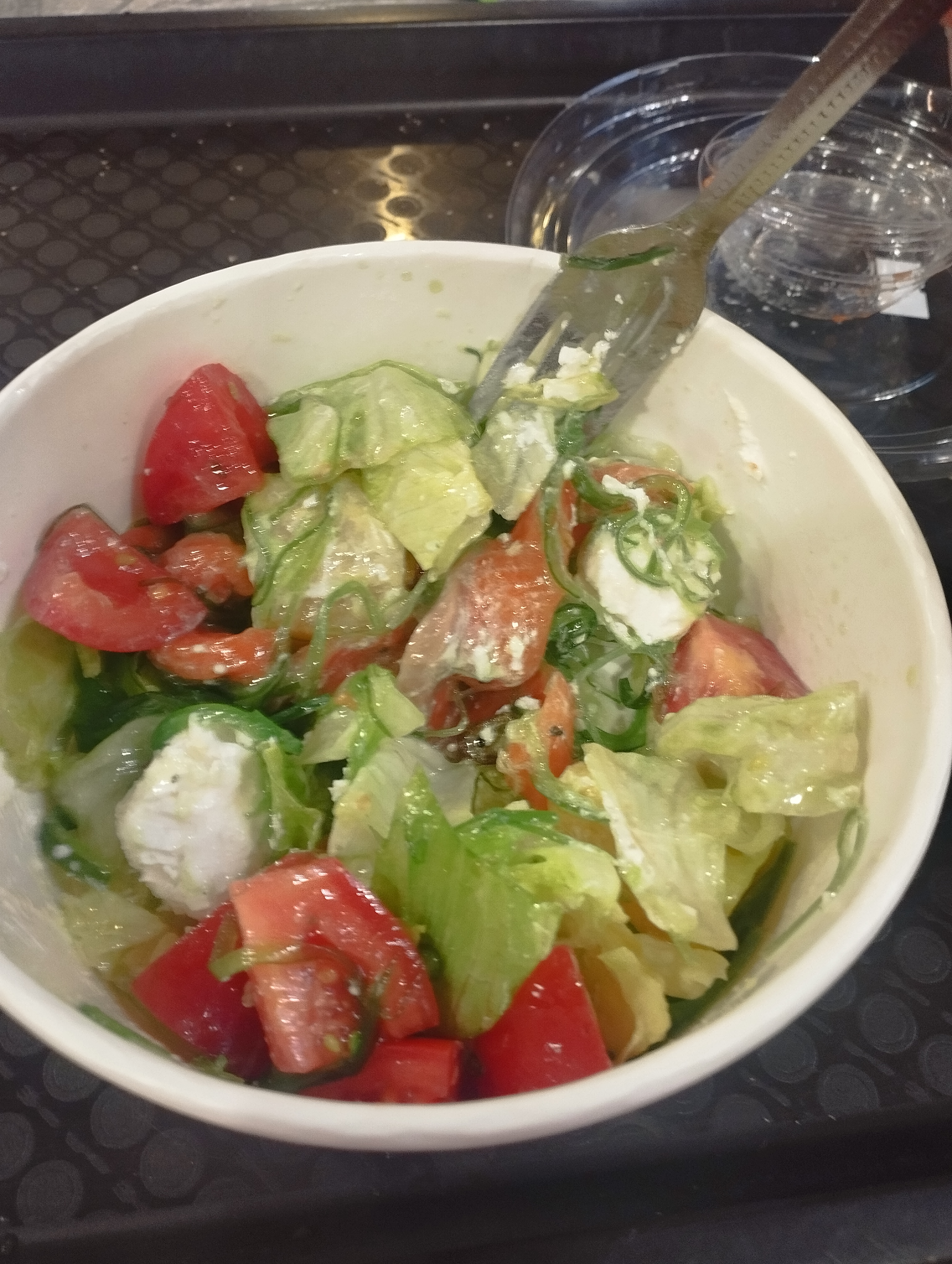 Салат из сёмги, апельсинов, помидоров, греческого сыра, водорослей и сладкой заправки. Вкусно!