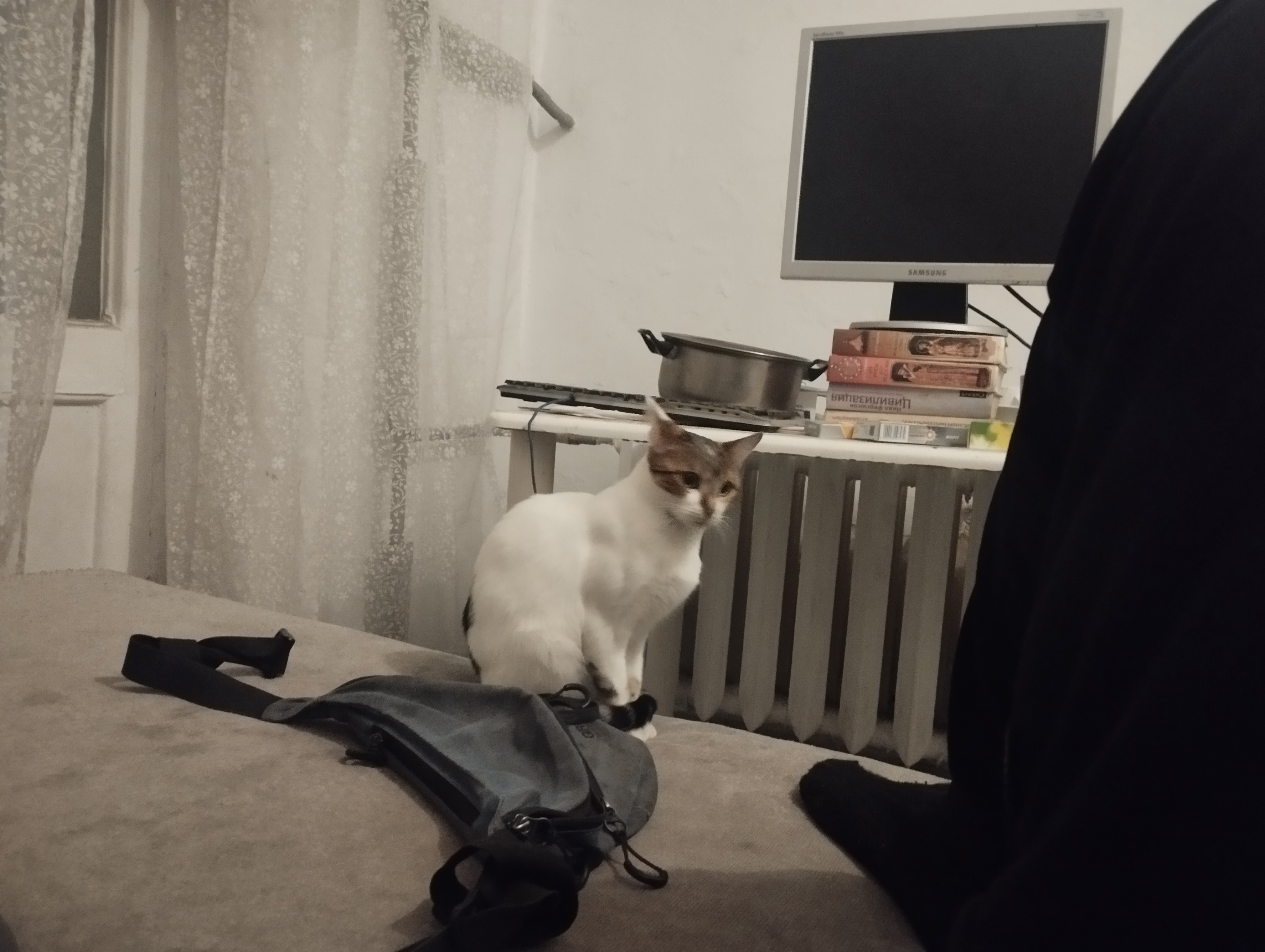 Сегодня кошка настолько обнаглела, что сначала легла рядом со мной на кровать, а потом полезла на обеденный стол. Оказывается, у неё грязные лапы. Да и монитор надо будет укрепить, если куплю новый, дорогой.