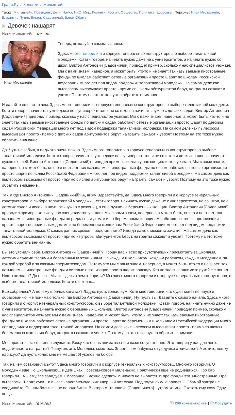 >>15599>Бля, с этими вашими ихними днюхами-юбилеями совсем забылаВсё таксист так, сис.Днюхи эвридэй, днюхи эвривэа.А ведь вчера (позавчера), 3 апреля, Виктору Антоновичу исполнилось ажно 87! Эт даж не Кирюшины недавние 78! Тут перемена мест в цифири имеет огромадное значенье!В этой связи вспомнилась мне совершенно великолепная статеечка 10-летней давности выдержки одного из моих самых любимых журналюг-публицистов, Илюши Ремесла Мильштейна. Называется она «Девочек нашарят». Тумбача ещё не было, а ржать хотелось. Поэтому каждый мой день начинался с этой статьи.Сейчас так не пишут. Илюша был тонким журналистом.Штош, поехали.Ссылочка на Грани — https://graniru.org/opinion/milshtein/m.242296.htmlНо можно и опикриловать, ежели для кого Грани за гранью возможного.