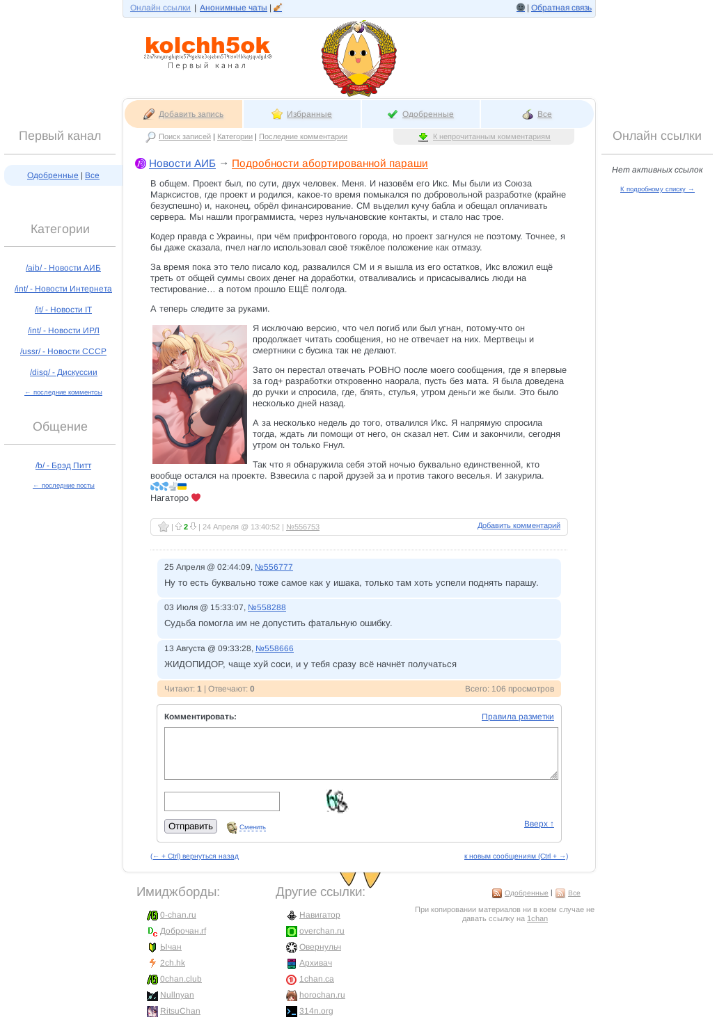 Крутяк, ждём в твёрдом переплёте, чтоб по почте пацанам отправить!У меня какие-то pdf-ки валяются на дискетах, хотелось бы побольше нормовых калодайджестов здравых и прочих зинов насобирать — полистать, почитать, подрочить.Кстати, подрочить — у меня, кажется, есть все выпуски Алисы, классный журнальчик так-то, однако, спешу разочаровать алисоманов — никакого отношения к творчеству группы «Алиса» и лично К. Кинчеву этот зин не имеет. А жаль... И слава Б-гу! Жаль, что в Союзпечати такое не продавалось, приходилось суррогат брать...>Не осталась незамеченным переделка (эдакий ремастер) предыдущего выпуска калодайджеста от команды Кальчика.А я уж подумал в глаза ебусь, кукуха едет!Помню же, что-то было не так! Теперь я збагоен.>Упоминание некоторых других персонажей бордосферы, вроде того же Фадюха, так же куда-то пропало по уже менее понятным причинам.Ебать, нежданьчик! Вот уж неожиданно так-то по кд. Я даж присел слегка, как прочитал, хорошо, что табурет был рядом, а то ведь мог и... быть не рядом.Фадик так-то лучший.Фадера прийде — порядок наведе!>Чмами констатировала смерть левача>деньги были распилены>нихуя сделано не было>все забили ХУЙКек, вот вам и красные леваки во всей своей левой красе! Ничего не напоминает? Ага, совок-совочек: пиздеть, пиздить и нихуя не делать, пока само не развалится.>самостоятельно сделать парашу Чмами не можетЗато учить других на лекциях — всегда пожалуйста. Как она оно с Арчем-то вообще работает? Или так и работает? Арч для крутых, Арч для продвинутых, мама, я на Арче, ммм.Поднять парашу не сложнее, чем рулить Арчем, скорее, проще, значительно проще.Ничё, скоро Чмама ещё выше взлетит — на BSD уедет, вознесётся, так сказать. Там мы её его их уже не достанем...Даёшь Сампиздат!Со вкусом С привкусом марксизма и анимэ!
