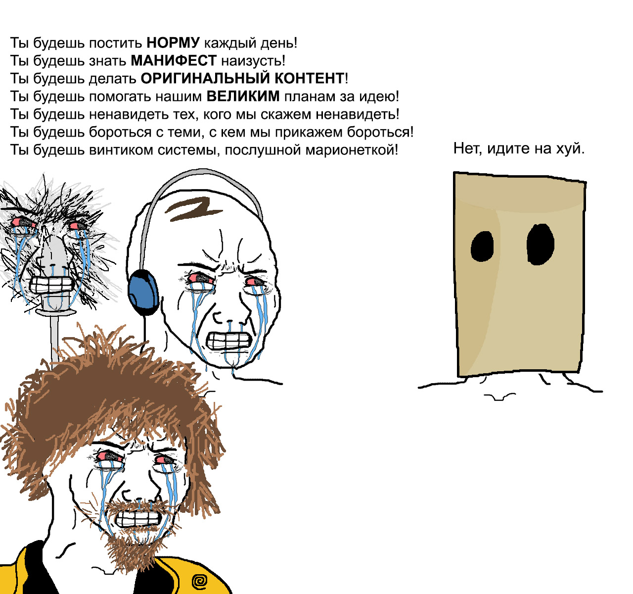 >>9934>Ты к кому обращаешься, лол.Да ко всем. Тема споров о краже бренда и все такое очень часто поднимается на ру аиб.>Сто процентов несогласия. Любое современное государство — враг, потому что не хочет, чтобы все мы жили лучше. Поэтому сотрудничать с ним — дело самой крайней необходимости. В то же время решать проблемы непосредственными силами граждан — абсолютно верно, потому что никто, кроме нас самих, не может помочь нам полноценно.Я с тобой тоже не согласен. Но знаешь где у тебя фундаментальная ошибка согласно теме этого треда (обсуждение меты, обсуждение платформ/площадок для общения (конкретного их подвида: АИБ))?Если ты так думаешь, ладно, можешь распылять свои полит.взгляды и кичиться ими к месту и не к месту (я кстати скорее думаю что ты делаешь это ради шутки или может в целях гейткипинга а не потому что ты искренний собеседник, уж извини).Но человек с такими взглядами у тебя, и не приемлет существование самой проблемы в виде кражи «Бренда». Если у тебя такие взгляды, то ты вообще должен кричать о том что никакой проблемы нет. И тем более тогда ты должен со мной соглашаться в том, чтобы замять тему споров о бренде ДВАЧ, или бренде НУЛЬЧАН или бренде ДОБРОЧАН.На первом плане должно быть только сообщество анонов, и особо не важно на какой платформе они решили (временно долго или не долго) побыть. Админы же здесь могут быть только благодетелями, то бишь некоммерческими активистами которые свои ресурсы жертвуют в целях благотворительности. Но они все такие почти.И тут админство скорее такое, и на ичане тоже такое, и на rf.dobrochan.net тоже такое. Прям злых продажных гадов меньшинство внезапно.