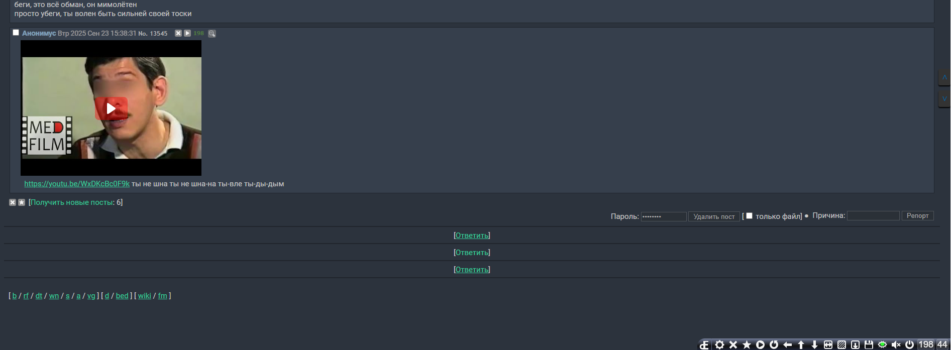 >>14058Чуть ранее упомянутый колчок от Владика, он же 1chan.0chan.club, просто существует. Учитывая то, что сейчас он существует даже вне своего домена, скорее всего он просто не мешает, вот и бултыхается где-то рядом с нульклубом просто чтобы был. В конце концов, никогда не знаешь, как карта ляжет. Можно вспомнить тот же horochan.ru, который был околомёртвым всю свою историю, а потом, внезапно, разлился пиздюльч и через 10+ лет существования он получил свою минуту славы.Самым активным, если это можно так назвать (имею ввиду, что активность невероятно низкая в целом по меркам колчков), колчком остаётся 1chan.ca, от которого наконец отъебался вайпух и дал дышать. К сожалению, контент оставляет желать чего-то лучшего. Опять же, минутка субъективности, мне просто не интересно сидеть там и читать то, что там пишут. Как будто постинг захватила нейропипися из начала десятых и заполнила собой буквально всё. Ну и мышеплаксовый симпозиум иногда проскакивает ещё, да-а. Впрочем, так как критическая масса оставшихся колчаньек скооперировалась именно там, в клирнете, новости в том числе нужно тягать и оттуда. В конце концов, калодайджест, прежде всего, мультибордовый проект. Но и свои корни не забывает.В целом, колчесфера конечно же остаётся в несколько раздробленном состоянии. Основная масса осталась в клирнете, хотя на какач всё равно не зайти без VPN, поэтому так и так посещение колчка превратилось в ДРОЧИЛЬНЮ, куда бы ты не захотел зайти из РФ. Небольшая горстка так же не ленится искать новые и новые мосты для тора, чтобы зайти на сучок. Скорее отношу себя ко второй категории, но ввиду деятельности, надо быть примерно везде.Не осталась незамеченным переделка (эдакий ремастер) предыдущего выпуска калодайджеста от команды Кальчика. Почтён! Но хочу заверить, что никакого отношения к переделке не имею, о чём вроде и было упомянуто. Почему-то в некоторых местах меня уже начали приписывать к примкнувшему к той команде и трудящимся в кооперации с, но хочу заверить, что я по прежнему являюсь никому в хуй не упёршимся независимым одиночькой и пока не имею планов это менять, хотя и ощущаю, что для дальнейшего роста и масштабирования калодайджеста эту позицию надо немного поколебать. Если что, буду держать в курсе. В любом случае, благодарен за дополнительное внимание и дополнительный канал распространения калодайджеста команде BEER.Пожелаем же ВСЕ-ГО ХО-РО-ШЕ-ГО нашей родненькой колчесферочьке и двинем дальше. Обязательную часть прошли, а теперь читать далее.НОУНЕЙМ ПАРАША ИЗДОХЛАОтведу отдельный блок в дань памяти ноунейм параше, из которой появился прекрасный навигатор бордосферы. К сожалению, после долгого простоя почти до конца лета он проработал абсолютно непродолжительное время и закрылся, теперь уже видимо навсегда. Как админ и обещал на сайте, он закрылся 1 сентября. Помянем!НОВЫЕ СРАЛЬНИКИЧестно, хотел поклацать ВСЕ новые сральники и написать обо всём по чуть-чуть, но они копятся и отмирают так быстро, особенно на доменьчиках третьего уровня и в onion-сети, что некоторые умерли быстрее, чем я добрался до полноценного написания этого выпуска. Так что что-то посмотрел, что-то не посмотрел. Не судите строго, посоны!И да, скажу сразу, я знаю про АОБУ и о ней будет отдельный блок ниже, поэтому она преднамеренно не будет находиться в этом блоке более, чем в этом абзаце. Про onion так же