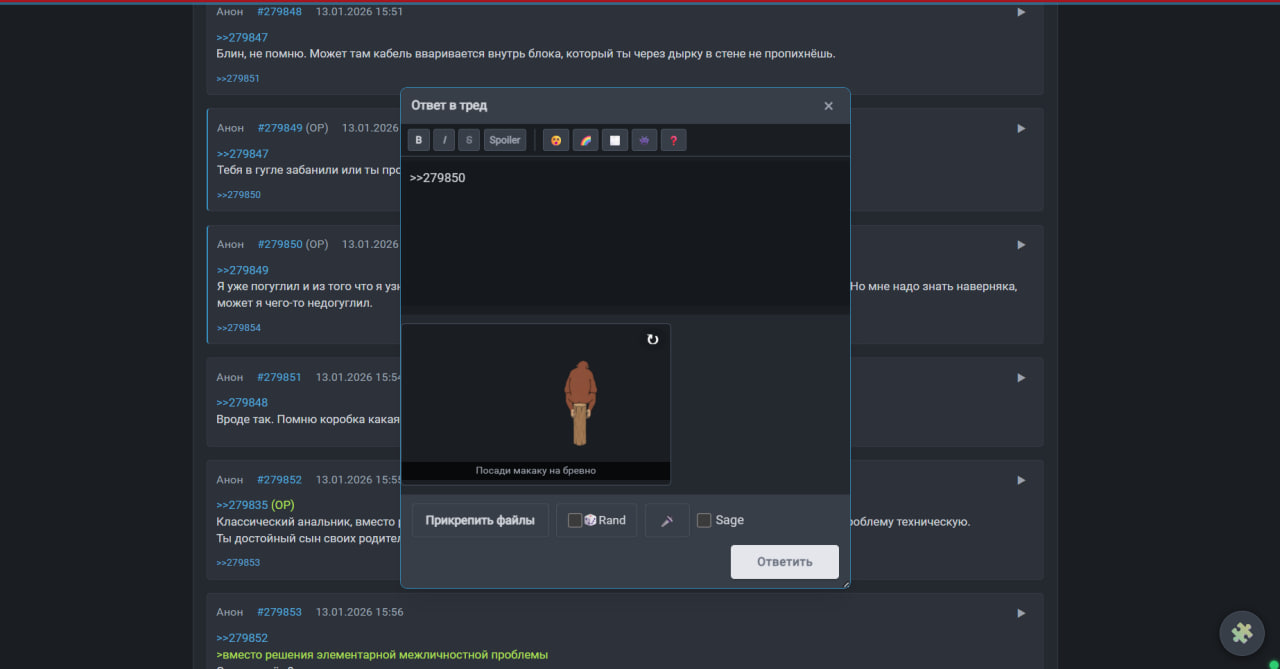 Не ждём — готовимся!Тумбалий превозмогает!Самый посторгазм — эт подписанная месага, лол, а ключи где, родимый? У свекрови, ёпта? Ароматной молодушки?Сука, Тумба не открылась, а терпил уже щемят!Но, вообще, каждое Андрющкино послание землянам отдаёт печалью великой...>1 января 2026 года Тумбачу — 10 лет.Помянем.>Хочу выразить признание всем тем, кто дождался, и почтить память тех, кого уженет с нами. Терпение и вера в этот проект — мой главный стимул.Помянем.>Десять лет — путь длиннее, чем ожидалось. Обстоятельства IRL часто отодвигалиимиджборды на второй план. Но сейчас пришло время завершить когда-то начатое.С тех пор многое изменилось, и сегодня Тумбач для меня — прежде всего движок,созданный с любовью и упорством. Работа над ним идёт практически каждый день,поскольку больше не осталось других способов прожить мою жизнь с пользой.Помянем.Движок... штош, посмотрим. Защемлённые лицевые к осмотру, когда выяснится, што без скриптов половина функций движка недоступна. Про базовые даже не заикаюсь, каюсь...По идее этот движок должен быть лучше ололорда, хотя и оло был неблох весьма. Мне Писюнчик нравился, такой милый:3>В ближайшие недели (ха-ха, я не умею ставить цели и планировать) допишу движоки настрою инфру, и здесь заработает имиджборд. Первая версия будет базовой, ноеё хватит для полноценного общения. Со временем запилю планировавшиеся функции.Сейчас активно изучаю DevOps и прочие штуки, чтобы поднять это всё.Дрон, мы понели, что с тайм-менеджментом у тебя есть определённые проблемы, ничего страшного, у других с этим ещё хуже. А вот про девопсов ты, конечно, загнул, ты уже сеньором должен пыхтеть над молодушками джунами, какие девы? Какие псы? Опомнись, Дрон!>Когда запустимся, сможем открыто обсудить дальнейший путь. А сейчас главное — открыться поскорее, чтобы наконец собраться вместе.Не ждите меня, я не приду. Я замужем уже...>Надеюсь, это начало нового этапа для Тумбача, без привязок к датам и пафоса.И не надейся. 10 лет, блять, из них половина — это заглушка с ежегодным переносом старта. Вторая половина — моча, шиза и поебень. И лишь короткий момент перед закрытием 2020 был неблох. Только потому что ты забил болт и можно было срать в три жопы.>P.S.>Да, мне тоже не нравится весь этот «грузовик едет в столб.gif», но так вышло!Да ладно, норм, чё ты?Смотря, какой столб и какой грузовик. Телеграфный vs Oshkosh вполне себе.
