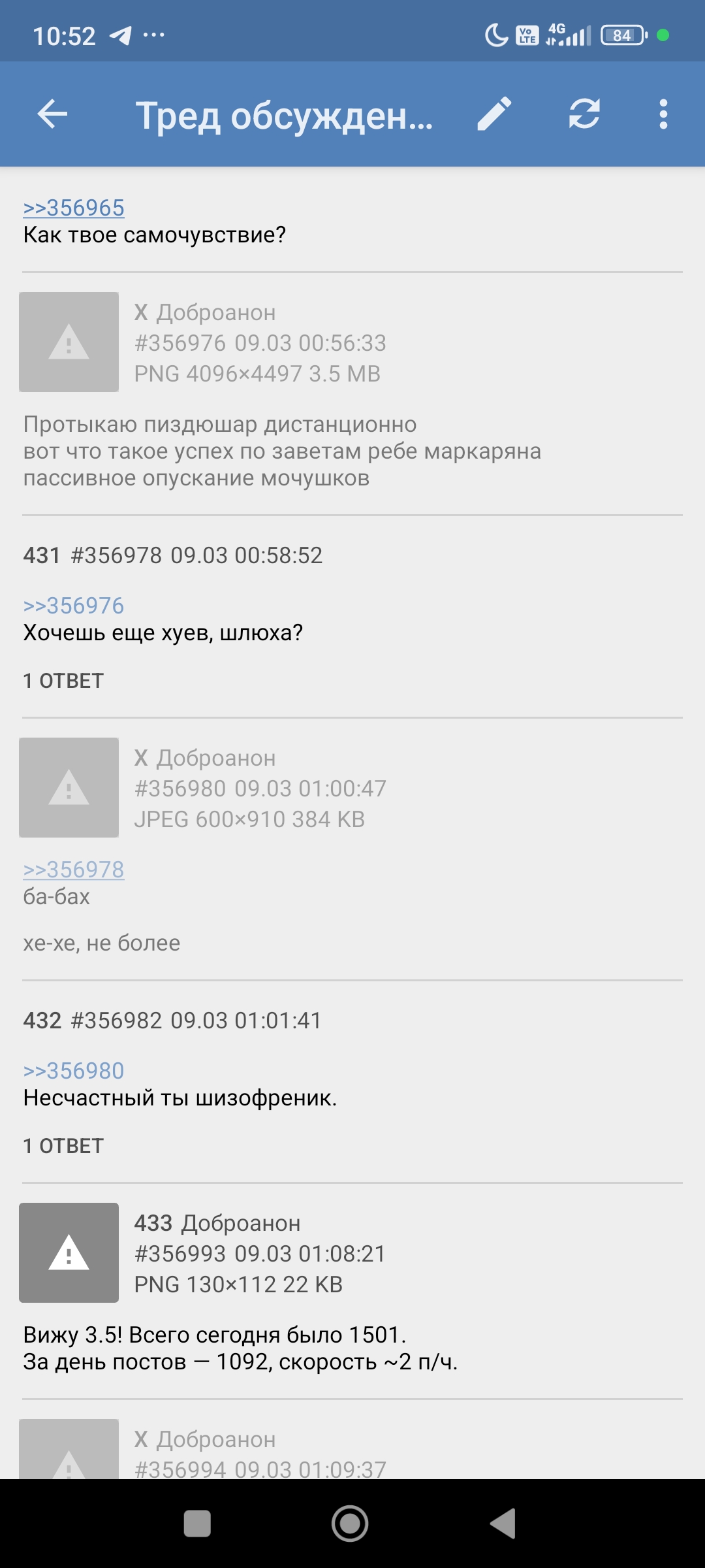 Вот интересно, Новак.Как тебе живется?Ведь смотри, ИРЛ — ты должен денег и перспектив каких-то нет пока. Максимум, курьерство.На бордах — все иные проекты почему-то тебя выгоняли. Уже год мертвому присосачу, а все равно в поиске введя «Доброчан» появляется оригинальная борда, а не это вот место.Ты пишешь маняфесты, что-то делаешь, а все не приводит к результату.Даже в твоем же мертвом чате, где у половины бан, а другая половина в ридонли единственный разговор — это поддеть тебя.Проекту год, а он пустой. Максимум что-то оживляет его — обсирание твоей параши и субботние попиздушки.И ты не поверишь, но именно это можно так же устраивать в ТГ\дискорде и админы многих посещаемых каналов это делают.А у тебя? Год, и подписчиков меньше, чем у девочки-админши анимечатика.Единственная вещь, что объединяет людей тут — лишь активное или пассивное глумление над тобой и твоим проектом.Ты правда этого желал? Быть не самым успешном и в жизни и на бордах.У тебя точно все хорошо?@SkrzydlataHusaria
