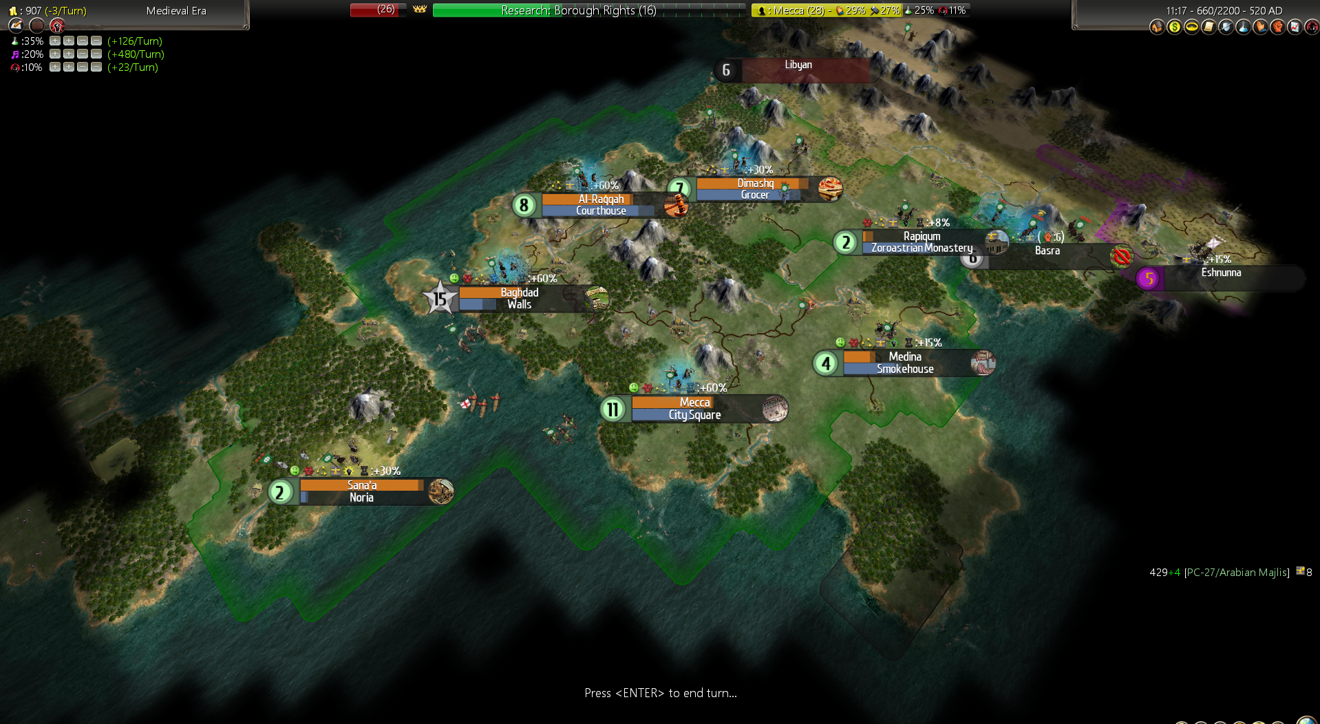 Новая партия. Интересный старт: на земле почти нет ресурсов и всё заросло лесами. Я пытался сыграть от статуи Зевса (тогда всюду появились бы храмы на пищу), плато Наска (распахать всё под фермы), от оракула в связке с даосизмом (эта религия не требует ресурсов для счастья народа), от буддизма (распространить среди северных варваров и иметь там влияние). Меня опередили во всём. Теперь я планирую ёбнуть Фаросский маяк и играть от торговли, захватить все уникальные ресурсы типа железа или видного на скрине перца, чтобы все от меня зависели, а потом выйти на христианство (влиять на всех вокруг) или ислам (завоевать соседей при помощи горских воинов, а на удалённые страны влиять). Жаль, что леса придётся вырубить подчистую.